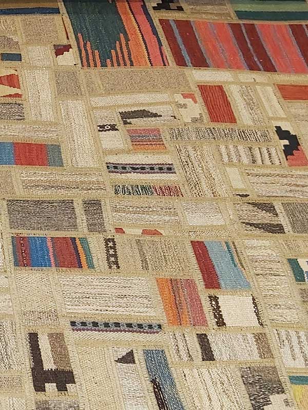 This piece presents a fresh take on upcycled textiles by focusing on visual clarity and spatial expansion. Rather than overwhelming a room, the vast cream field acts as a quiet canvas, allowing the intricate details of each vintage fragment to emerge naturally. These patches, culled from diverse weaving traditions, showcase ghosted geometric lines and ancient symbols that have been softened by time into a beautiful muted patina.