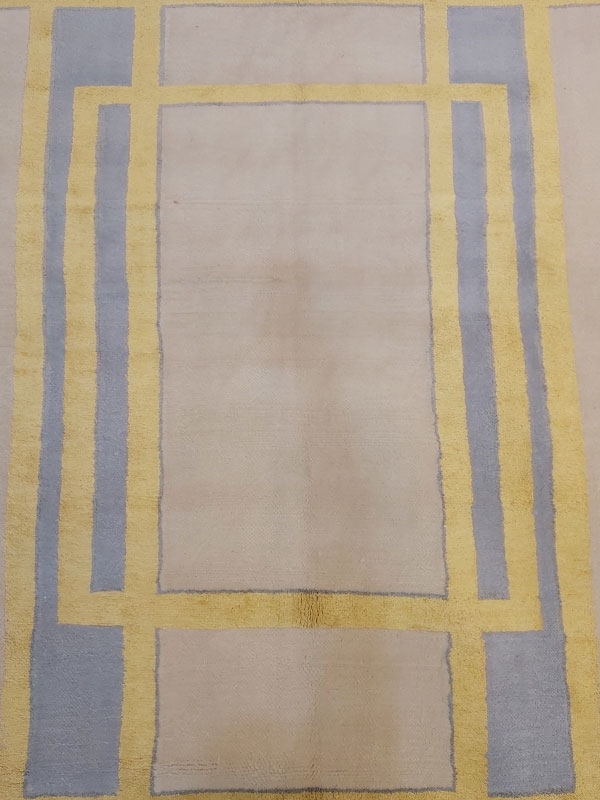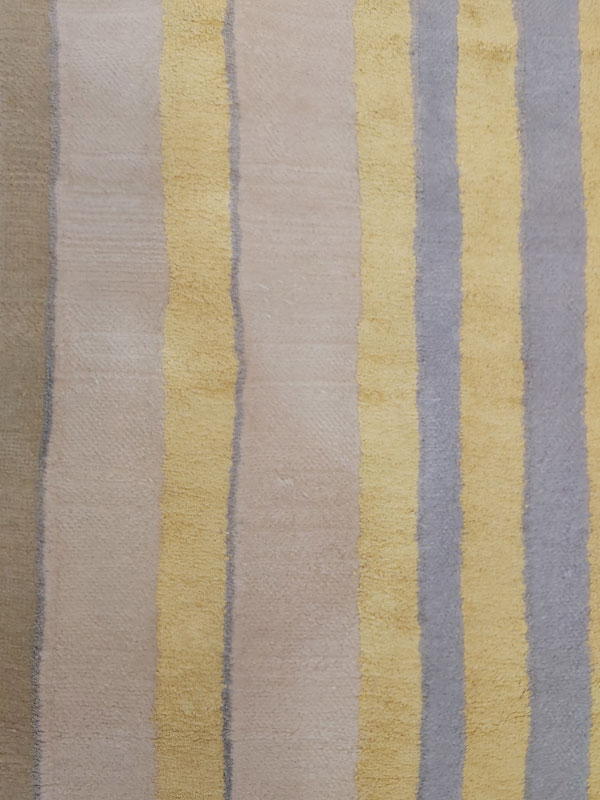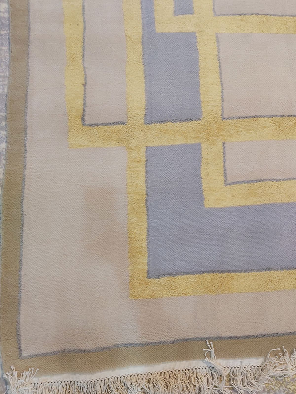 What truly elevates this piece is its interlocking frame design. The crisp, golden-yellow lines act as a highlight, giving the rug a three-dimensional quality that mimics the structure of a contemporary floor plan. This "low-detail, high-impact" approach is what makes it a best choice for luxury interiors. Because it is a handmade modern rug, you can see a slight, organic variation in the color (abrash) and the texture of the pile, ensuring that while the design is precise, the feel remains warm and inviting.