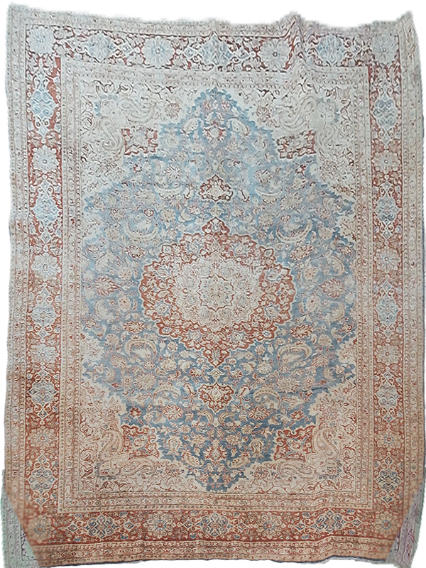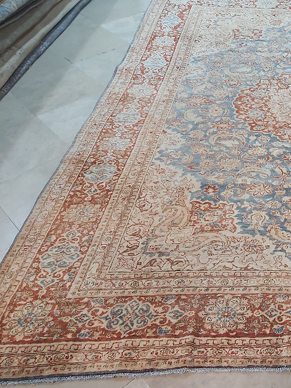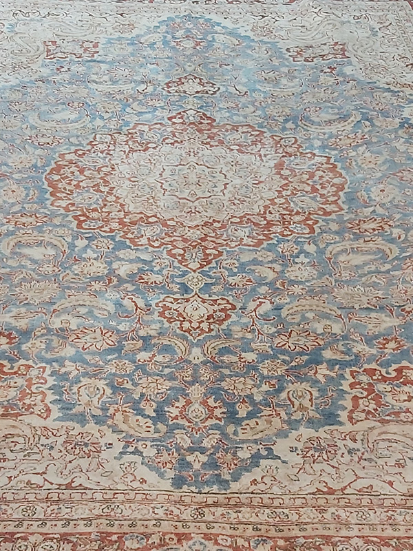 The rug features, a sophisticated palette of sky blue, terracotta, cream, soft beige, muted gold, and warm neutrals. The floral medallion design is framed by a classic Persian border, adding symmetry and visual rhythm. This combination creates a gallery‑style aesthetic that feels both timeless and rooted in tradition.